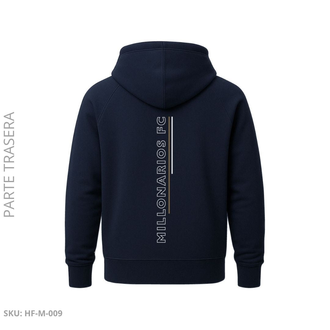 Buzo unisex en color azul oscuro con diseño moderno y elegante. En la parte delantera presenta la palabra “MILLOS” en diagonal con líneas doradas, junto al escudo y nombre Millonarios FC al costado superior. En la parte trasera, el detalle vertical “MILLONARIOS FC” refuerza su identidad deportiva. Fabricado en tejido suave y cálido, ideal para mostrar orgullo embajador con estilo y comodidad en cualquier ocasión.