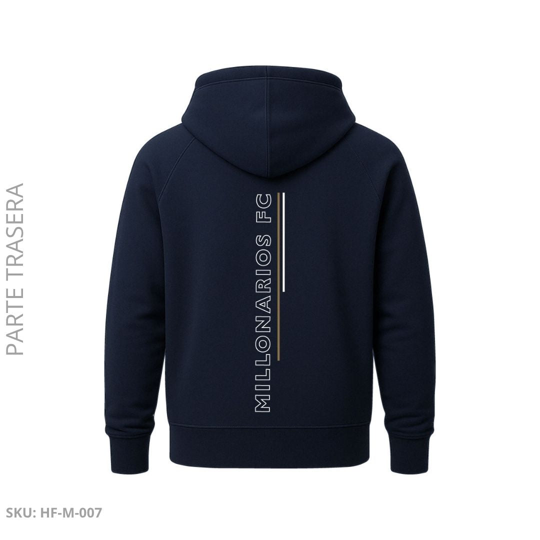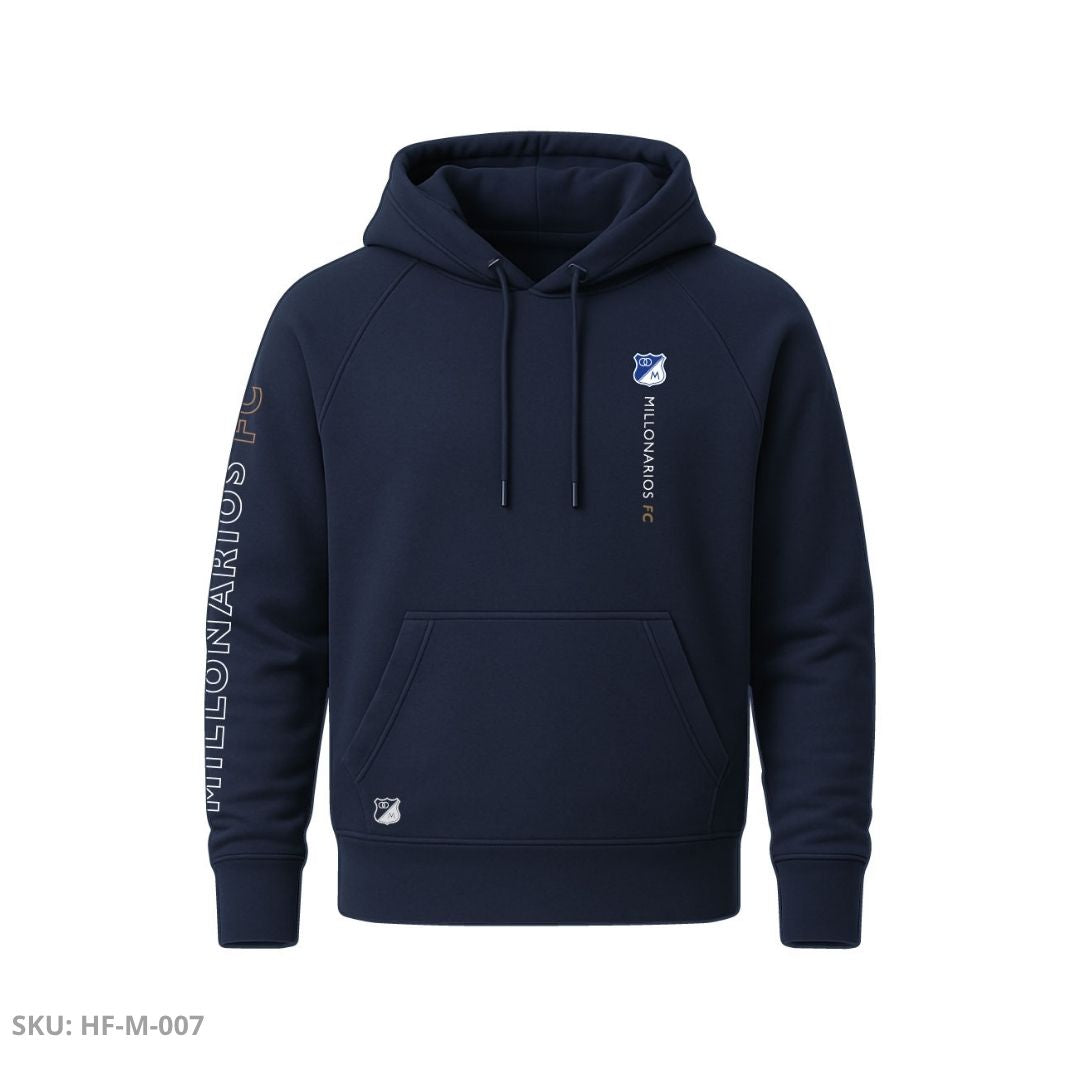 Buzo unisex en color azul oscuro con diseño moderno y detalles icónicos del equipo. En el frente lleva el escudo de Millonarios FC y la inscripción vertical “MILLONARIOS FC”, mientras que en la manga izquierda resalta el nombre del club en tipografía blanco–dorado que le da un toque distintivo. La parte trasera mantiene la misma línea con un diseño vertical minimalista del nombre del equipo. Confeccionado en tela suave, cálida y resistente, es perfecto para clima frío y looks casuales, ideal para lucir la pasión embajadora con estilo y comodidad.