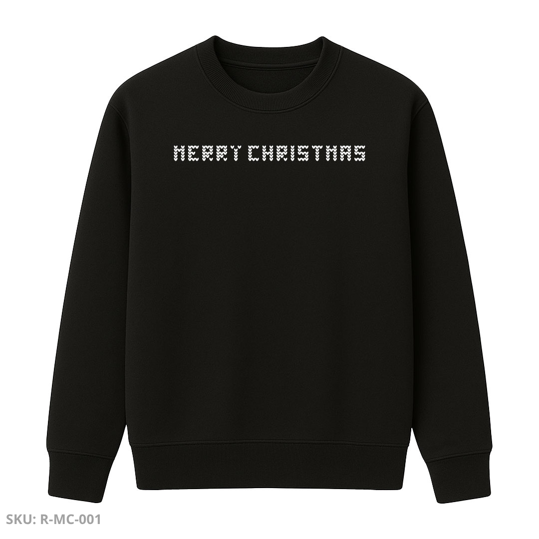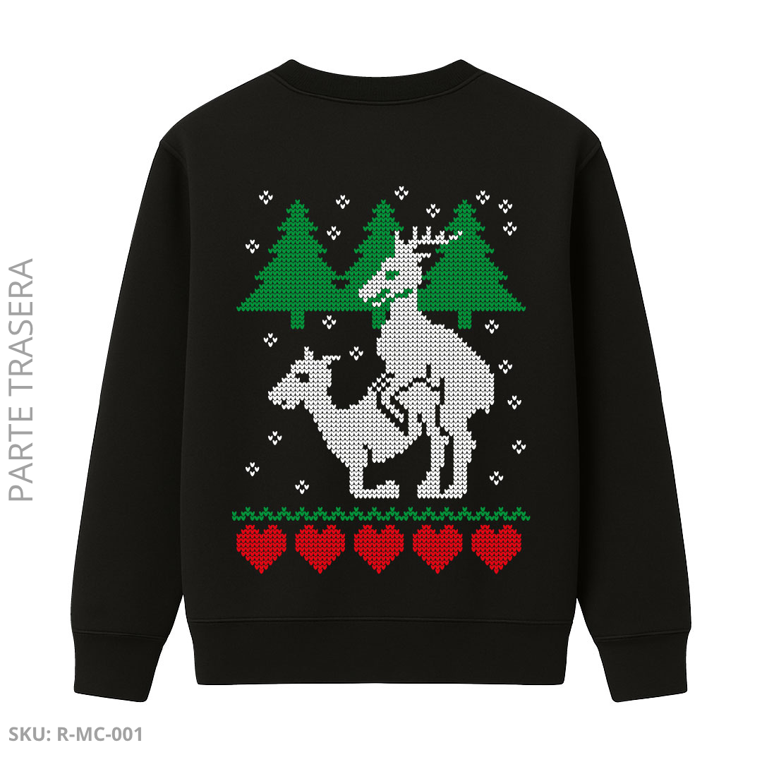 Buzo unisex en color negro con diseño navideño estilo tejido. En la parte frontal presenta la frase “Merry Christmas” en tipografía pixelada. En la parte trasera incluye una ilustración humorística de dos renos en estilo de punto, acompañados de pinos y corazones rojos, ideal para quienes disfrutan de un toque divertido y atrevido en Navidad.