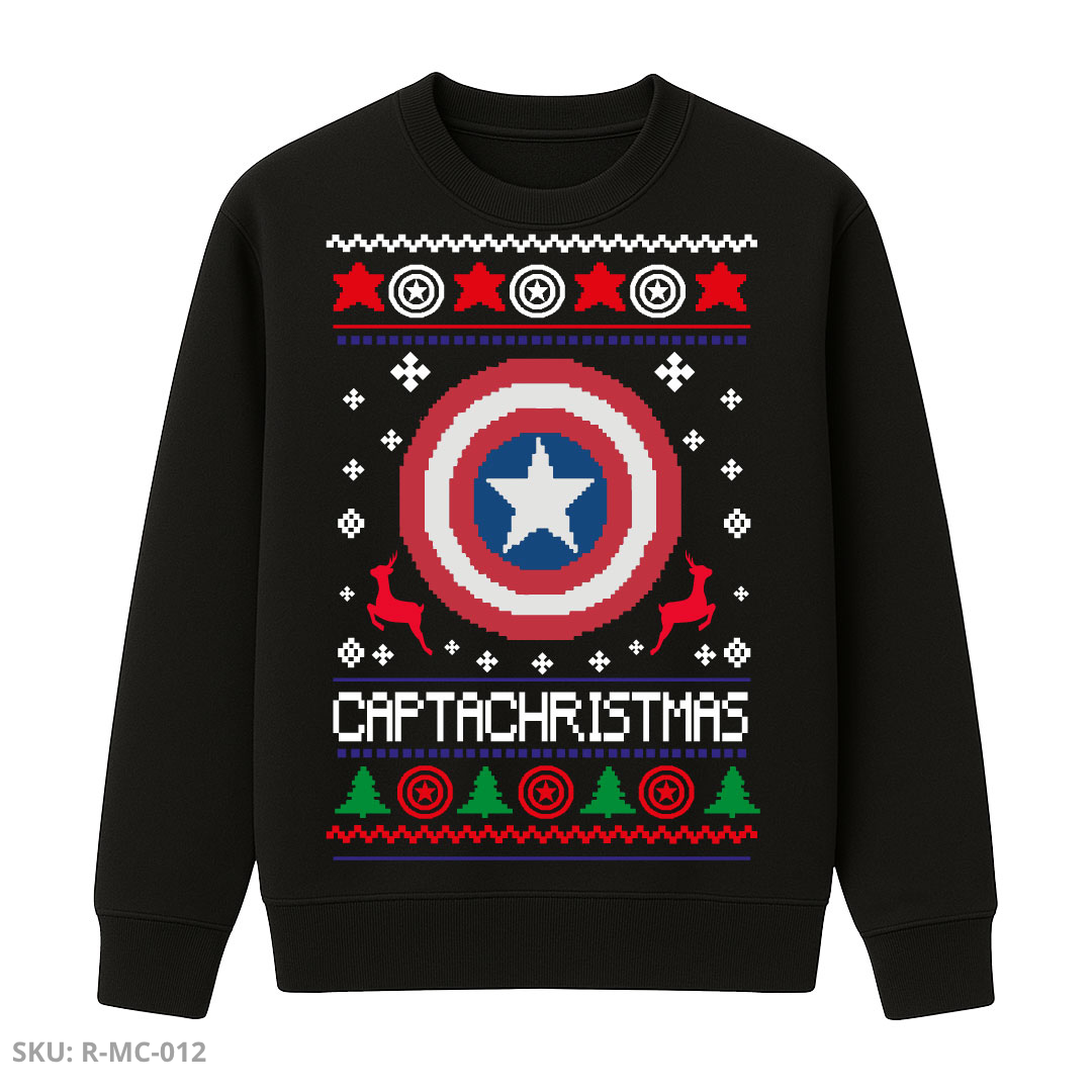 Buzo unisex navideño en color negro con diseño tipo “ugly sweater” inspirado en el Capitán América. Incluye el escudo patriota en estilo pixelado junto a elementos navideños como renos, copos y pinos. Fabricado en algodón perchado suave y cálido, perfecto para celebrar diciembre con estilo heroic