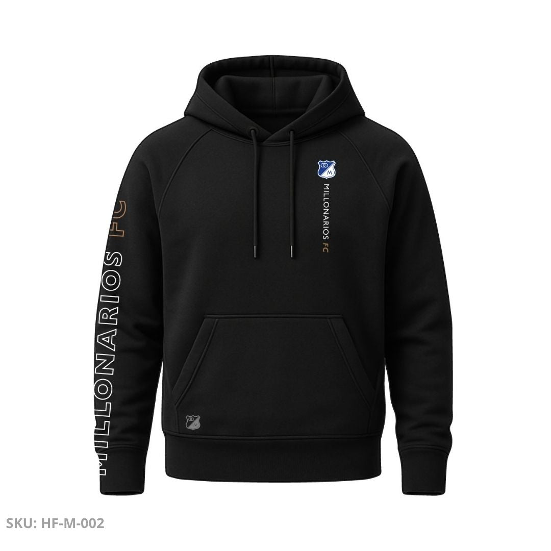 Buzo unisex en color negro, elaborado en algodón perchado de alta calidad para mayor suavidad y confort. Lleva en el pecho el escudo de Millonarios FC con la inscripción vertical “Millonarios FC” en blanco y dorado. Su detalle más distintivo es la manga izquierda con el nombre del equipo en gran formato, creando un estilo moderno y lleno de identidad embajadora. En la parte trasera se mantiene el diseño vertical del nombre del club. Incluye capucha ajustable, bolsillo canguro y puños acanalados. Perfecto para quienes buscan un look urbano con orgullo albiazul.