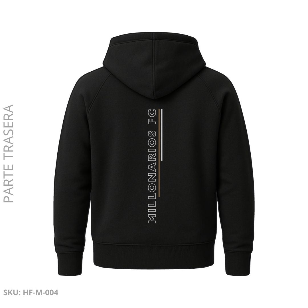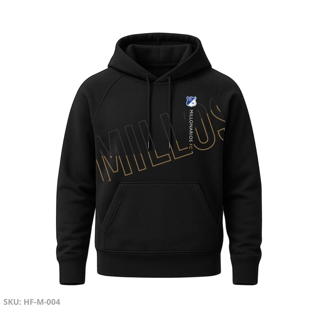 Este buzo negro Embajador destaca por su diseño moderno con el texto “MILLOS” en diagonal en un acabado dorado elegante, acompañado del escudo oficial en tamaño compacto sobre el pecho; su estilo combina identidad y minimalismo, mientras que en la parte trasera incorpora la inscripción vertical “MILLONARIOS FC” que refuerza el orgullo azul. Es cómodo, abrigado y perfecto para quienes buscan una prenda urbana con presencia del equipo sin perder sofisticación.