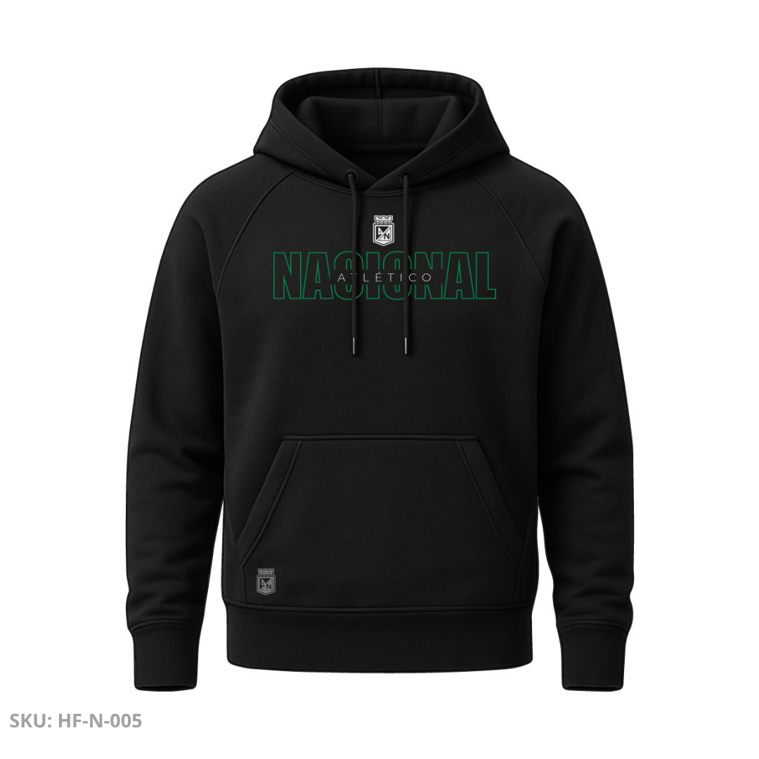 Buzo unisex en color negro, confeccionado en algodón perchado de alta calidad para ofrecer suavidad, abrigo y confort. En el pecho destaca la palabra “NACIONAL” en un bloque tipográfico moderno en color verde, acompañado del texto “ATLÉTICO” en un detalle sutil y elegante. La parte trasera es totalmente lisa, manteniendo un estilo sobrio y minimalista. Incluye capucha ajustable, bolsillo canguro y puños acanalados que brindan un ajuste cómodo y duradero.