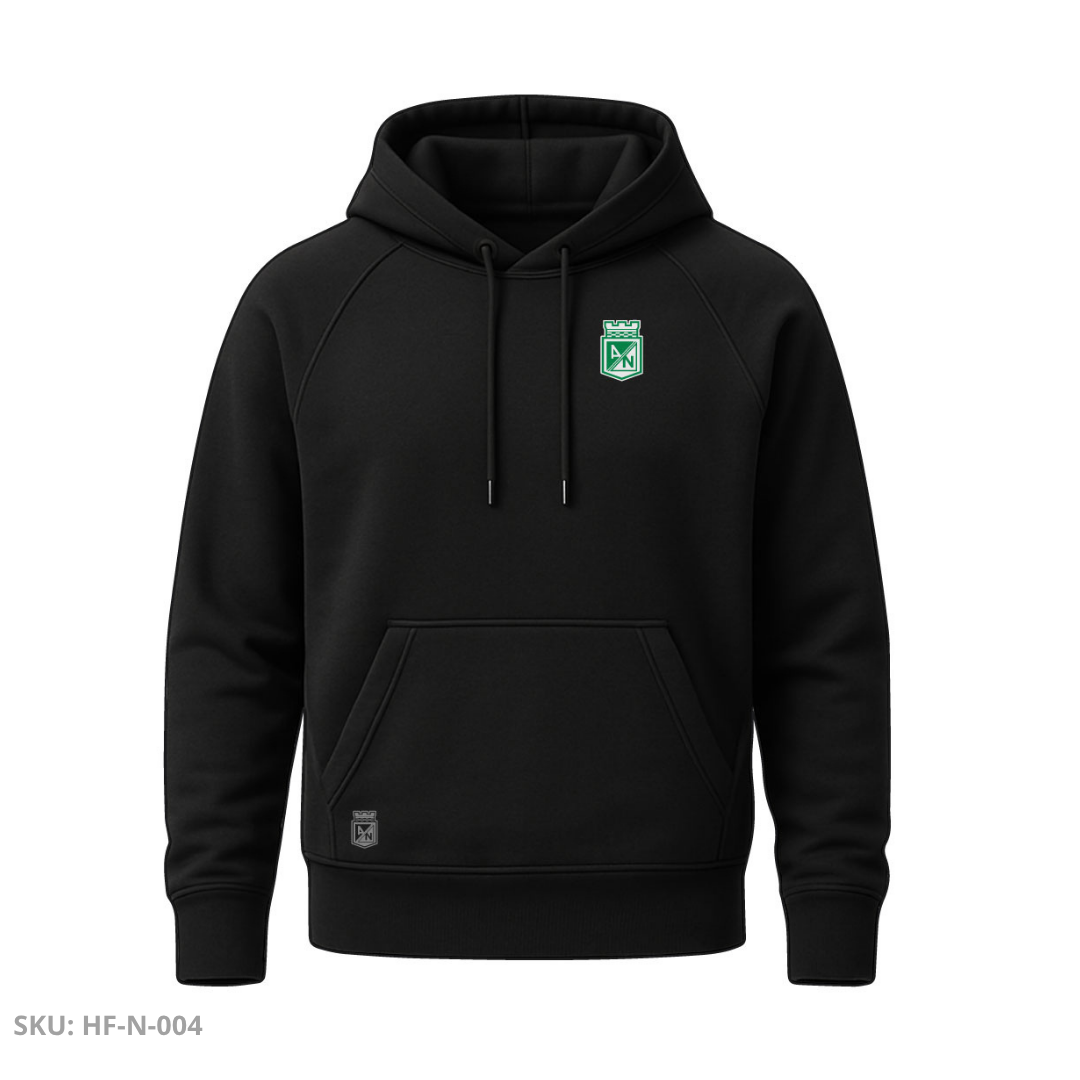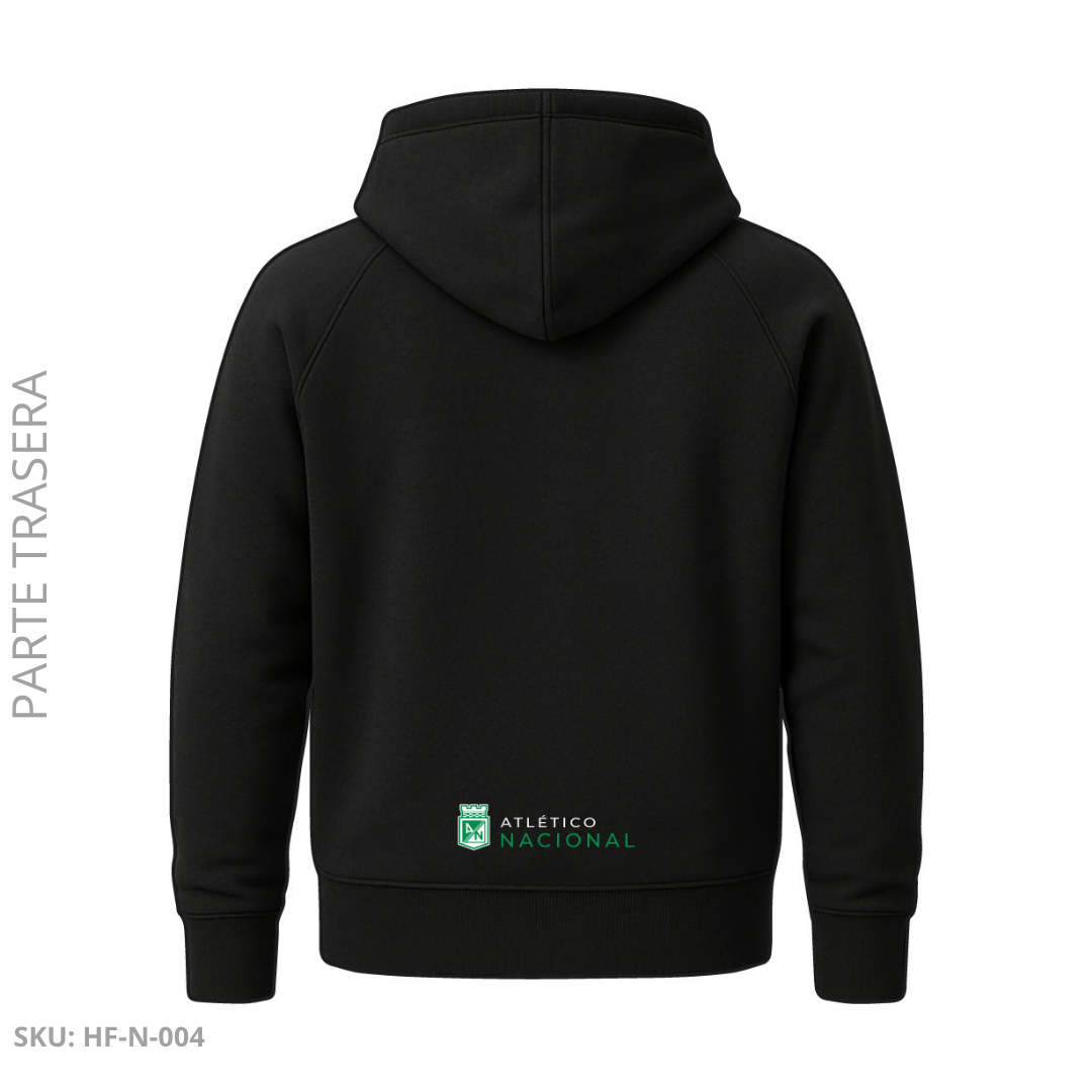 Buzo unisex en color negro, elaborado en algodón perchado suave y resistente para máxima comodidad. En la parte frontal presenta el texto “Atlético Nacional” en diseño limpio y moderno con combinación en blanco y verde. En la parte trasera incorpora una franja vertical con la palabra “Atlético Nacional” acompañada de un escudo difuminado, creando un estilo distintivo y elegante. Incluye capucha ajustable, bolsillo canguro y puños acanalados para un ajuste cómodo y casual.
