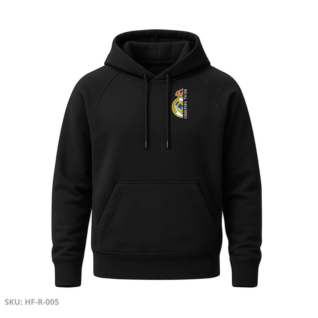Buzo unisex en color negro, elaborado en algodón perchado suave y resistente. En la parte frontal lleva un diseño lateral con el escudo del Real Madrid y la leyenda “Real Madrid” en formato vertical para un estilo moderno y distintivo. En la parte trasera destaca un gran escudo del club acompañado de la frase “Since 1902”, resaltando la tradición merengue. Incluye capucha ajustable, bolsillo canguro y puños acanalados para mayor comodidad. I