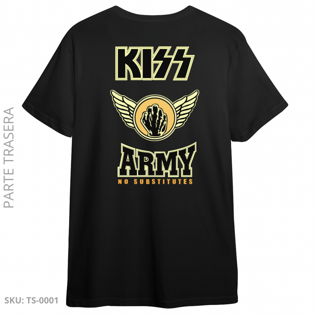 La parte trasera luce el logotipo clásico de KISS en tipografía icónica acompañado del escudo de la KISS Army y la frase “NO SUBSTITUTES”, resaltando el sentido de pertenencia y autenticidad del movimiento fan.