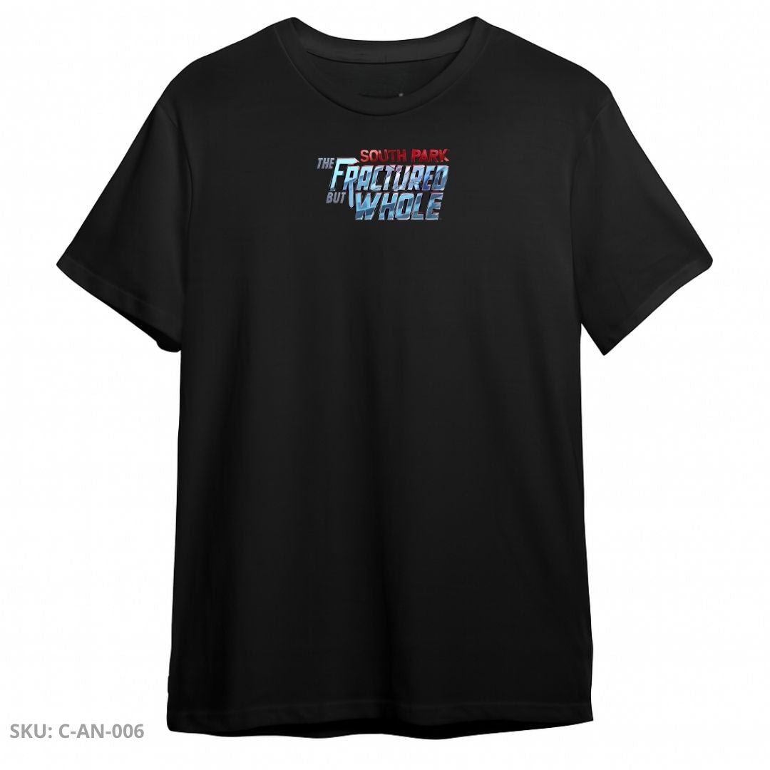 Camiseta unisex en color negro inspirada en el videojuego South Park: The Fractured But Whole. El frente presenta el logotipo del juego en composición tipográfica dinámica. La parte trasera muestra a los personajes icónicos de South Park en sus identidades de superhéroes, en una ilustración llena de humor, color y caos visual — sello característico de la saga.